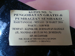 Para penerima sumbangan berupa pengobatan gratis dan sembako sedang mengantri di Klinik Dokter Burniawan Ramali Medan. Para penerima sumbangan berasal dari kalangan kurang mampu, seperti tukang becak, tukang sampah, tukang parkir, penjual minyak jalanan, penjual jagung, penjuang kue jalanan, penjual kacang jalanan, warga samping rel kereta api dan warga prasejahtera yang memiliki pekerjaan namun kondisi ekomoni cukup lemah.